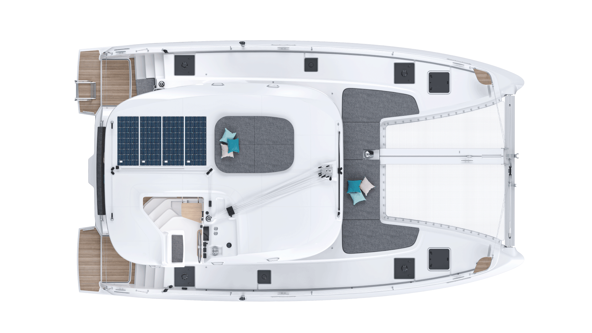 Venkovní posezení vybízí k posezení a otevřené přechody mezi kokpitem a salonem vytvářejí plynulé spojení mezi vnitřním a venkovním prostorem. Díky promyšlenému uspořádání je prostor na palubě optimálně využit - v souladu se stylem designu Lagoon.