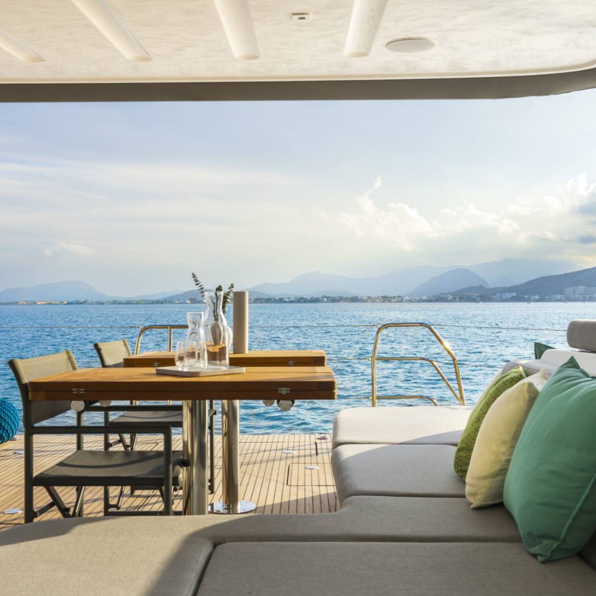Kokpit na zádi lodi Lagoon 60 je zcela otevřený k moři a nabízí výjimečný prostor. Otevírací vodní otvory umožňují okamžité plavání. Zadní kokpit je navržen tak, aby se stal vaším oblíbeným místem, a díky šikmým schůdkům nabízí snadný a bezpečný přístup.