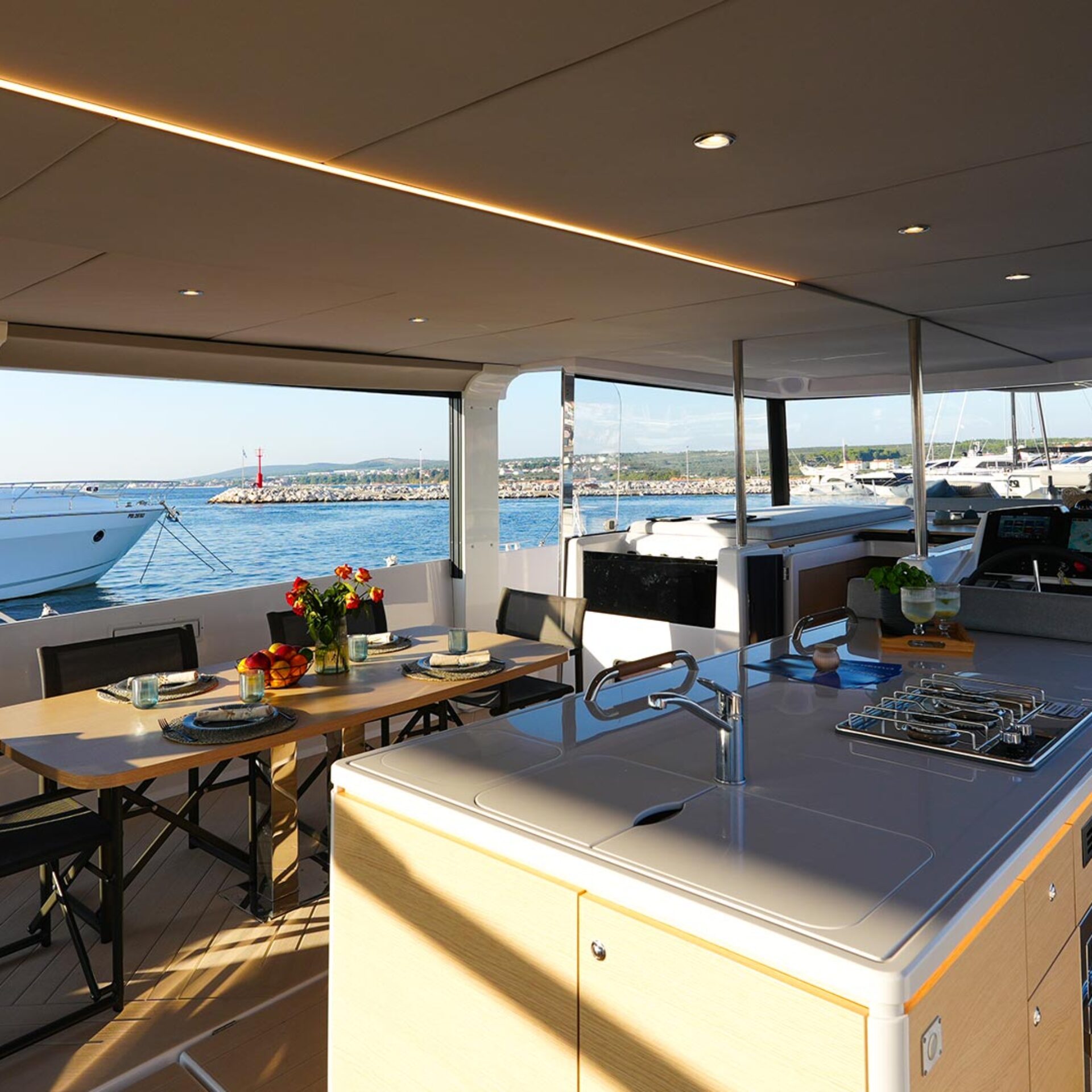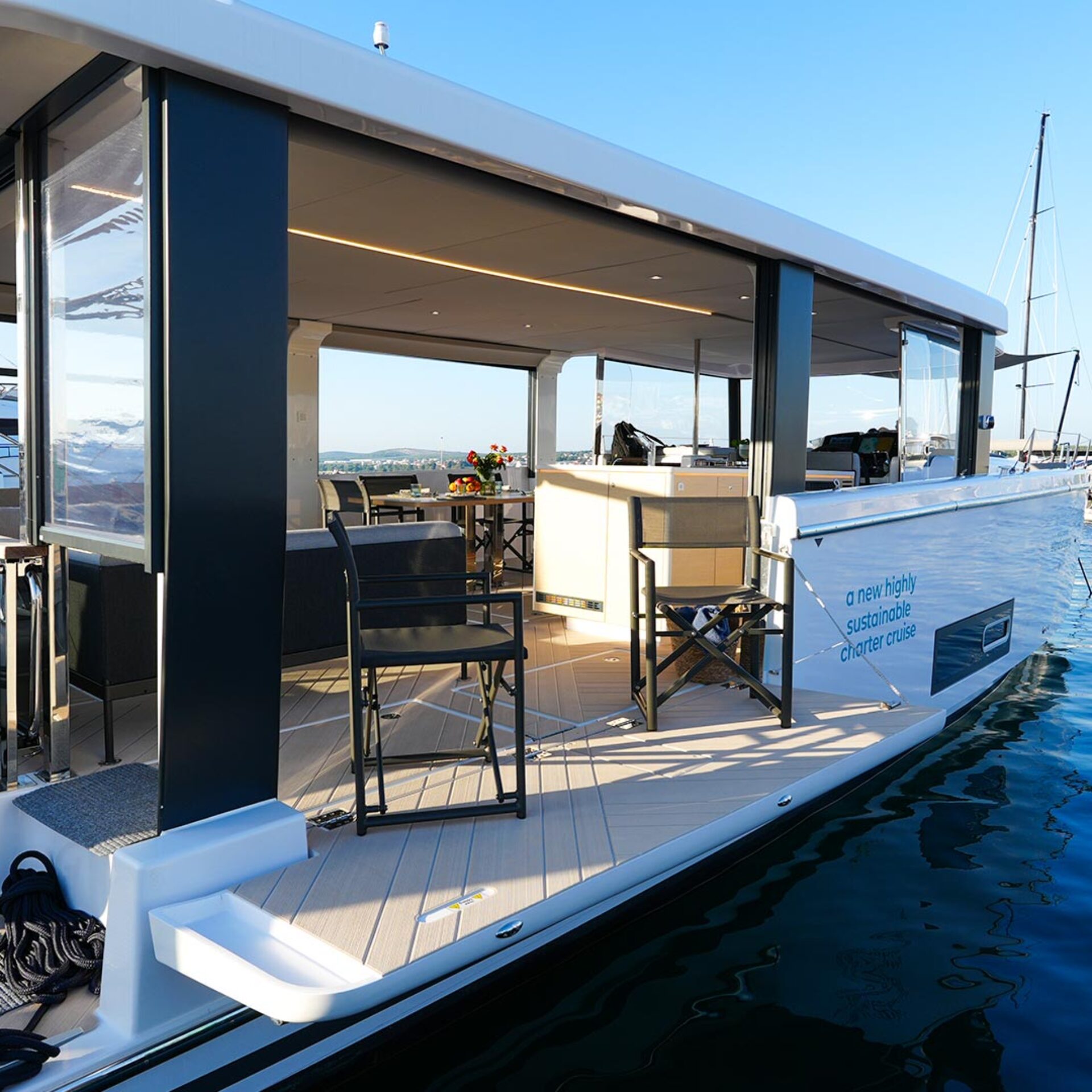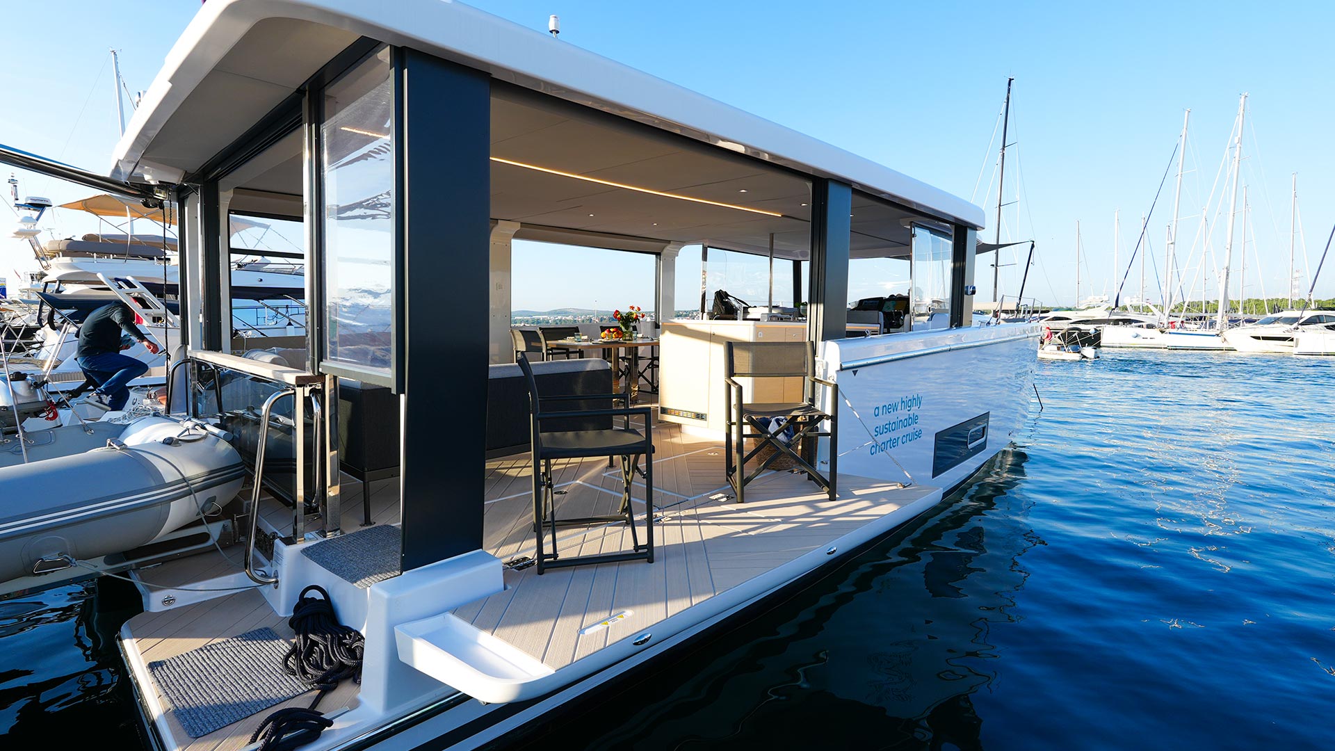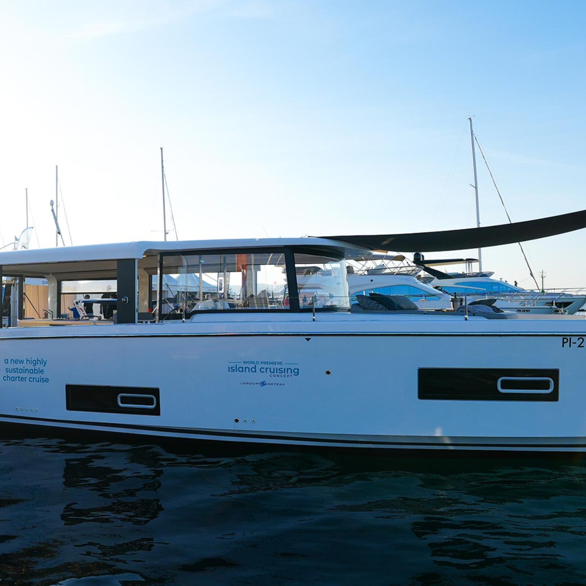 The Beneteau Monomaran Island Cruising Boat is a new and innovative boat concept by the Beneteau Group designed for charter, developed with the idea of sustainable navigation in mind. Based on data from 1,000 boats and 180,000 users, it meets the needs of yacht owners for enhanced outdoor experiences, simplified handling, and sustainability. Featuring a design focused on comfort and tranquility, the boat is equipped with a hybrid drive and a new-generation hull that reduces noise and lowers fuel consumption by 50%.