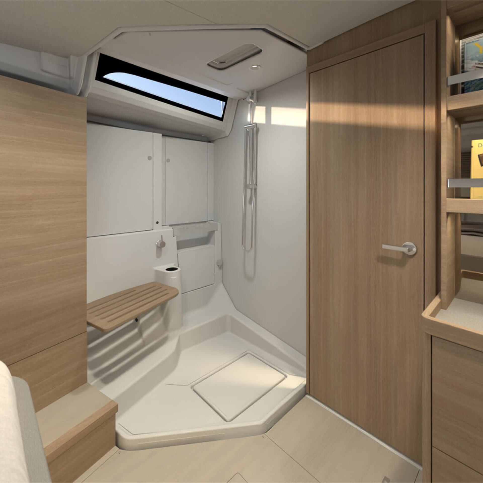 The saloon has been designed to prolong the time spent together. Top quality upholstery, using high-density foam, makes the seating really comfortable, while sanded oak woodwork and elegant trims create a warm, inviting atmosphere. You can personalise the interior to suit your preferences with a selection of fabrics and colours.