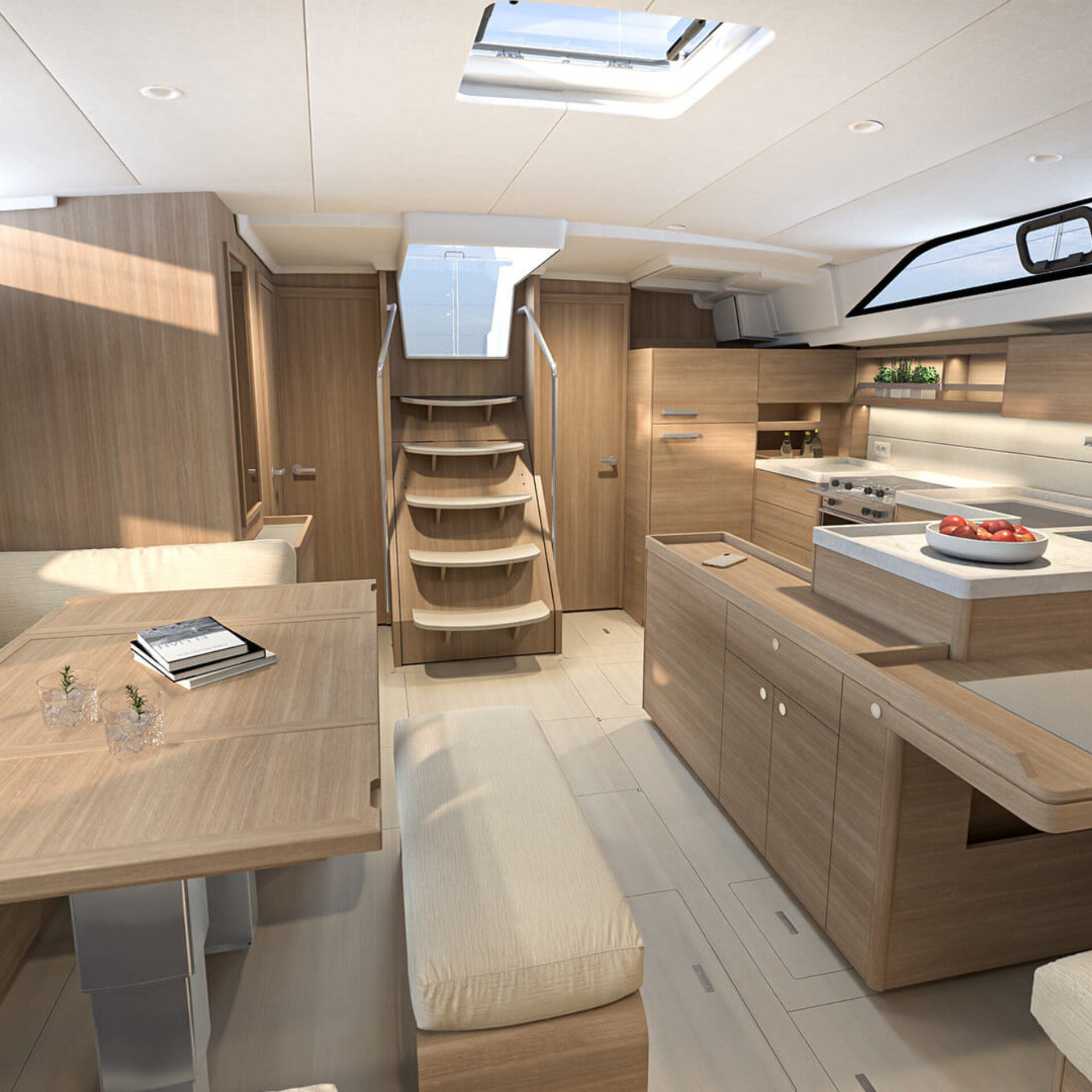Inside, every detail plays a part in creating a stylish yet relaxing atmosphere. The gently sloping companionway, a signature feature of Oceanis cruising yachts, leads to a bright living space, into which the C-shaped galley seamlessly integrates. Fitted with a full-height refrigerator and the option of adding a second, this cruising yacht offers incredible autonomy for family cruising. The Corian worktops and service hatch with storage areas make getting meals ready on board an enjoyable experience.