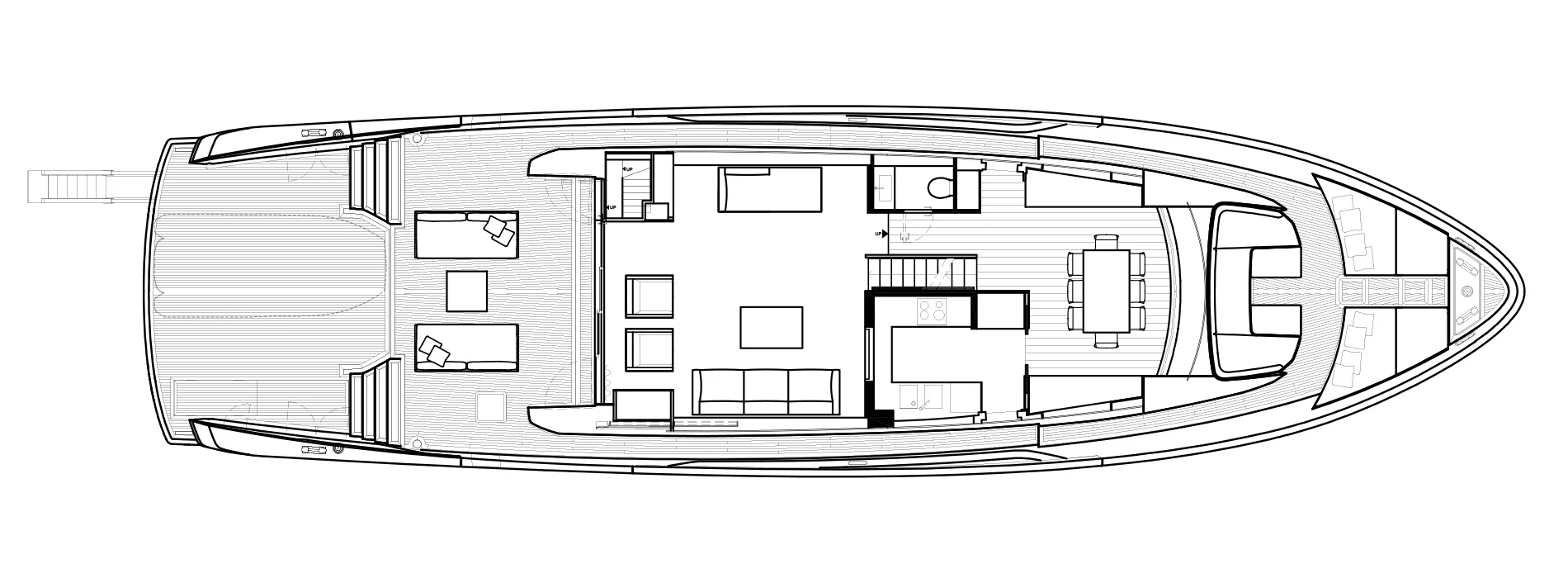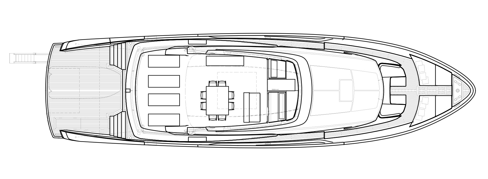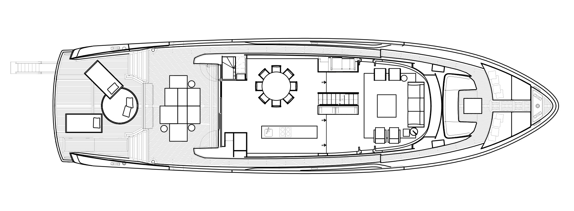 Inovativno kormilarsko mjesto na flybridgeu može se potpuno zatvoriti i klimatizirati bočnim prozorima s automatskim upravljanjem. Ali također koriste otvorenu glavnu palubu koja se proteže od pramca do krme na istoj razini – ekskluzivno potkrovlje na jahti od 27 metara. Alternativno, na ovu palubu se također može integrirati privatni veliki vlasnički apartman, što je apsolutna ekskluzivna značajka SX88 u ovoj seriji jahti.