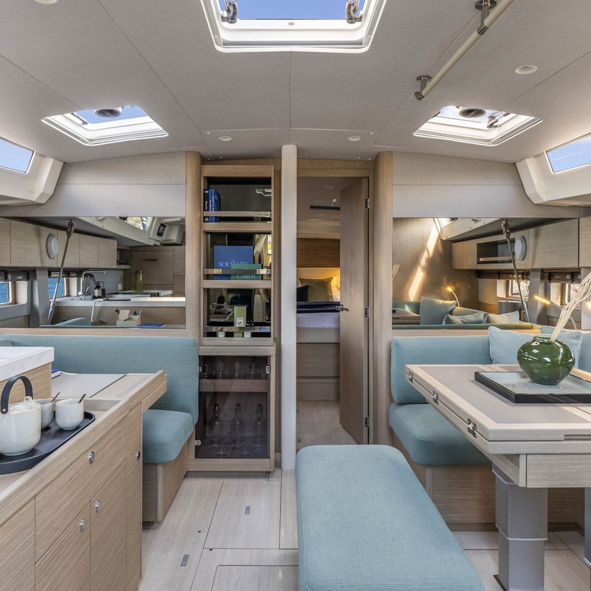 The saloon has been designed to prolong the time spent together. Top quality upholstery, using high-density foam, makes the seating really comfortable, while sanded oak woodwork and elegant trims create a warm, inviting atmosphere. You can personalise the interior to suit your preferences with a selection of fabrics and colours.